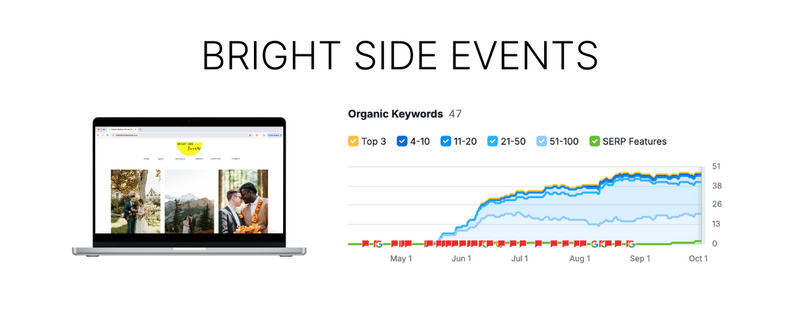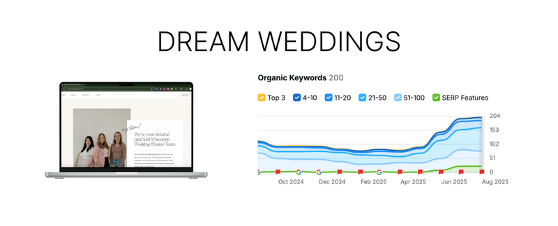 After completing the done-for-you SEO service, Kendra’s organic website clicks increased by 204%, her impressions grew by 630%, and her site now ranks for 429 keywords. Her online presence has taken off, leading to more consistent inquiries from Google! And this is only the beginning for Kendra.